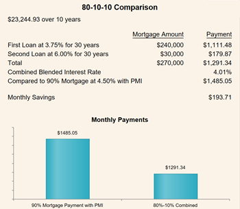 In the example, the 80-10-10 would save a buyer $193.71 per month which can be a considerable amount of money over a ten-year period. The interest rate on the second loan will be higher than the first because there is more risk.